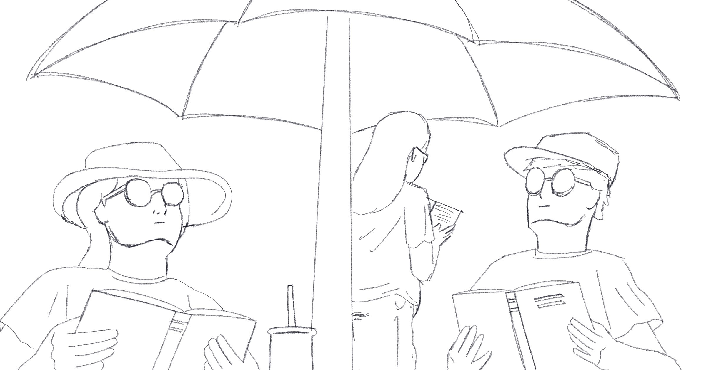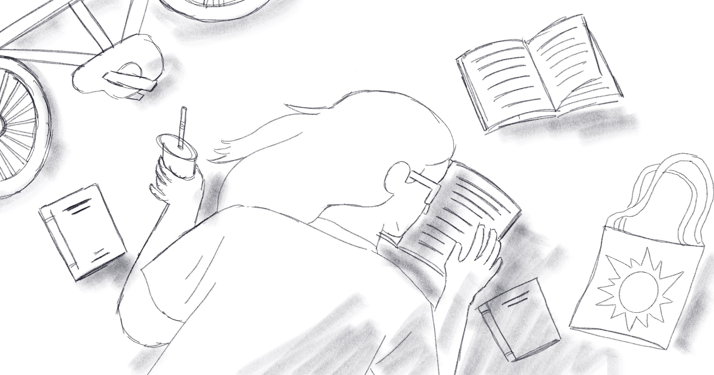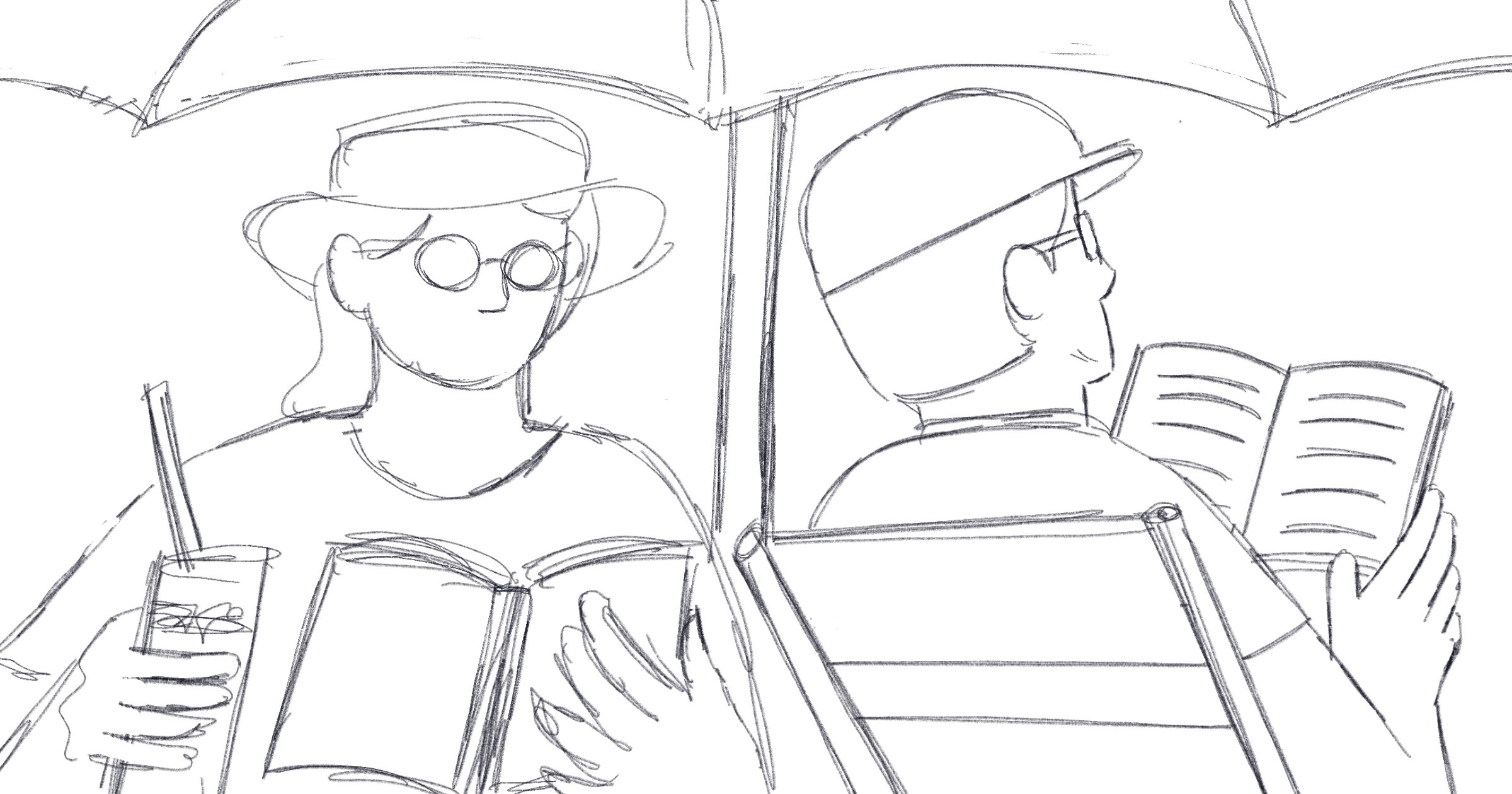 During the sketch phase, we experimented with various scenes of summer readers. One challenge was ensuring that each element could stand alone if the team wanted to use it elsewhere. Initially, the sketches didn't achieve this, either due to a lack of characters or standalone elements.